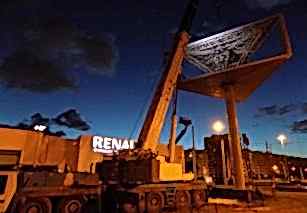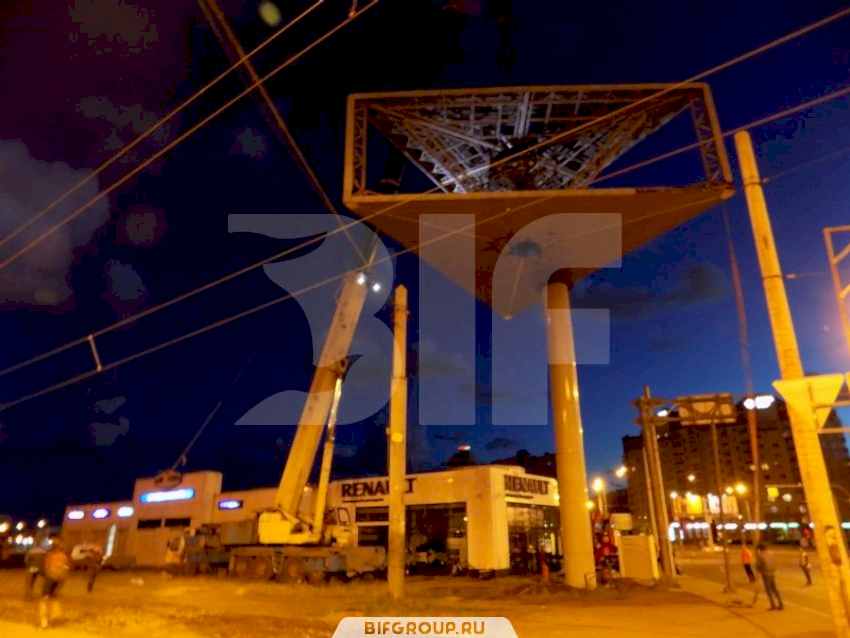 На Ленинском «Пин-ап» необходимо было демонтировать рекламную конструкцию в виде закрепленного на верху колонны трехстороннего короба. Учитывая большие габариты и вес рекламного короба, для демонтажа использовался мощный автокран Grove GMK 6220L грузоподъемностью 220 тонн,взятый в арендуу нас на сайте.